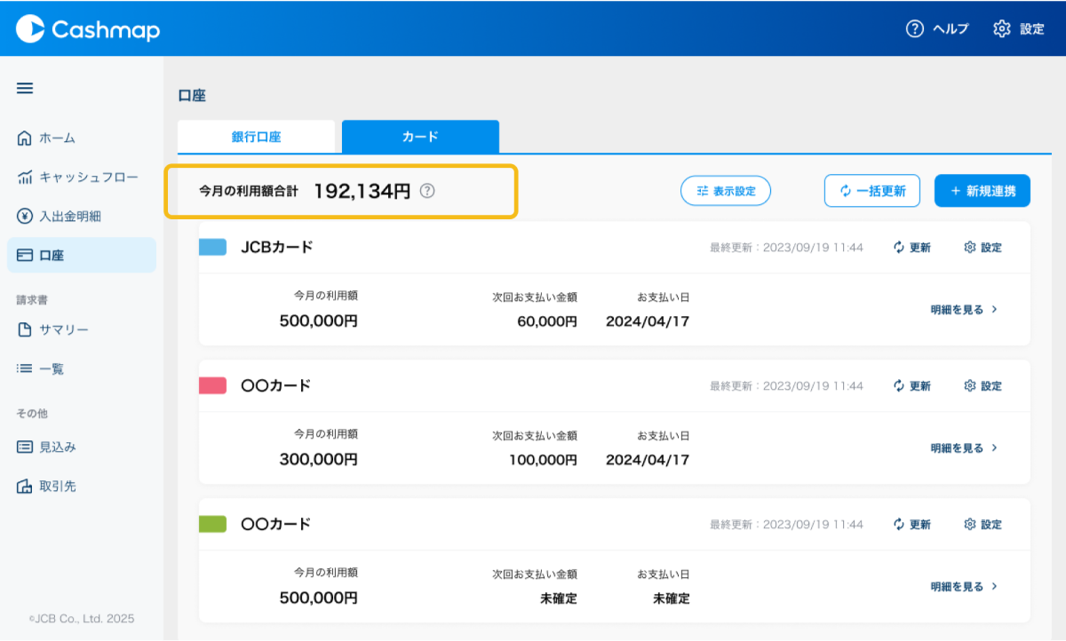 「カード」タブを表示している場合は、連携しているカードの今月の利用額合計・次回支払い予定額が表示されます。