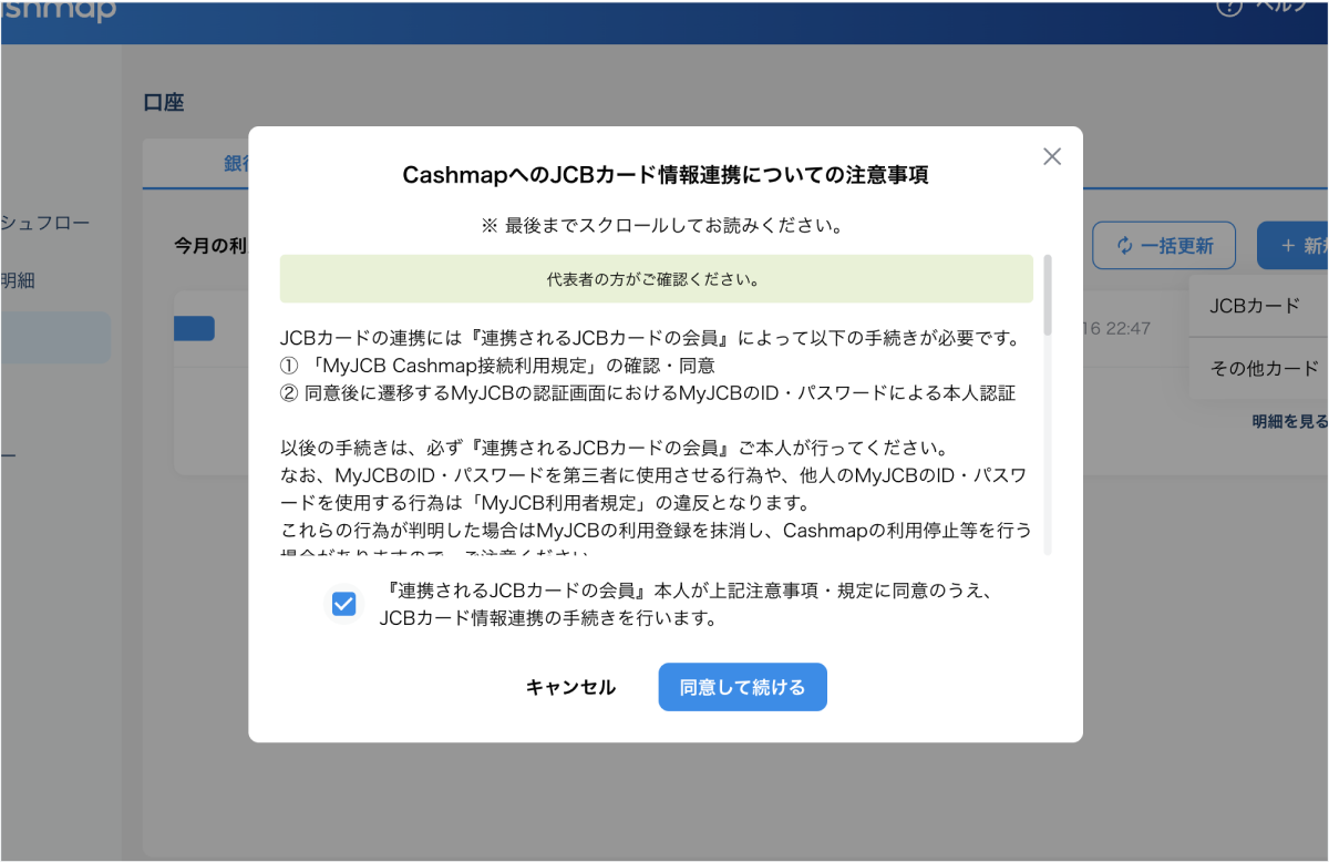 3. JCBカード情報連携についての注意事項を確認し、次に進む