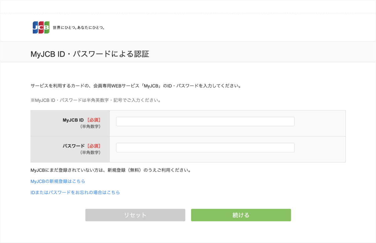 4. MyJCB認証画面へ遷移するので、画面の説明に従って必要情報を入力する