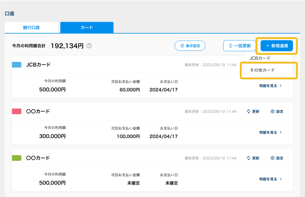 ※既に追加されているカードを再度連携した場合、利用明細情報が重複となり、キャッシュフロー画面の出金予測金額が正しく表示できませんので、同一カードの重複連携は実施しないでください。