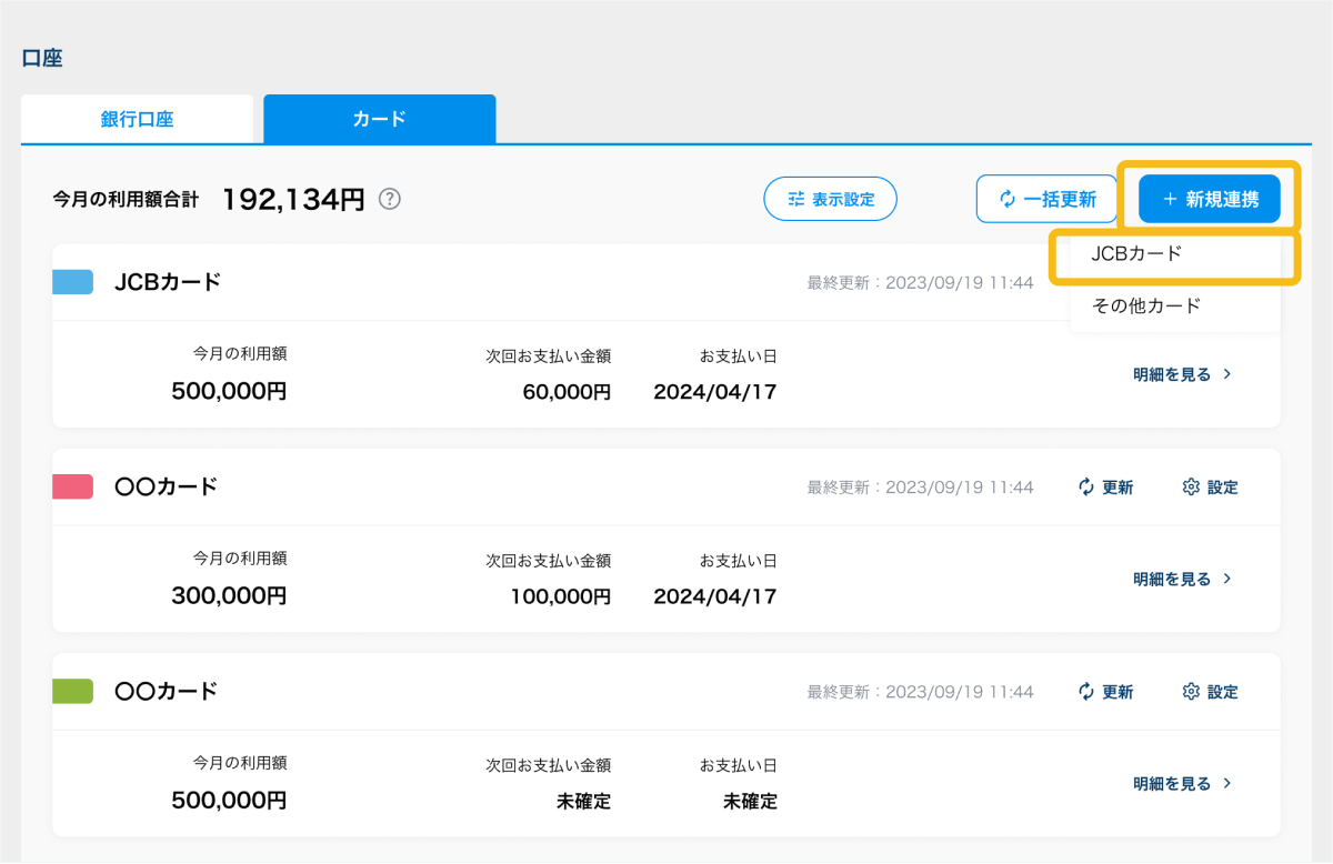 2. 「カード」タブを選択した状態で「新規連携」ボタンを押し「JCBカード」を選択