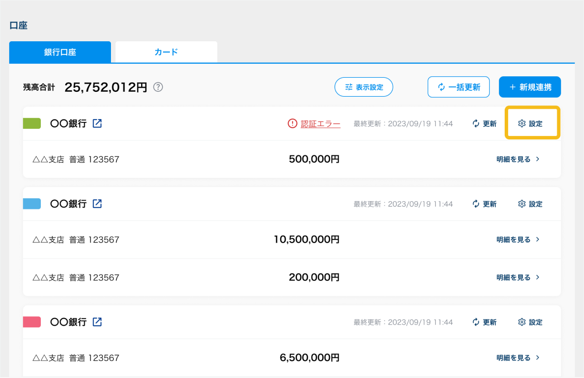 1. エラーメッセージが表示されている口座・カードの「設定」ボタンを押す