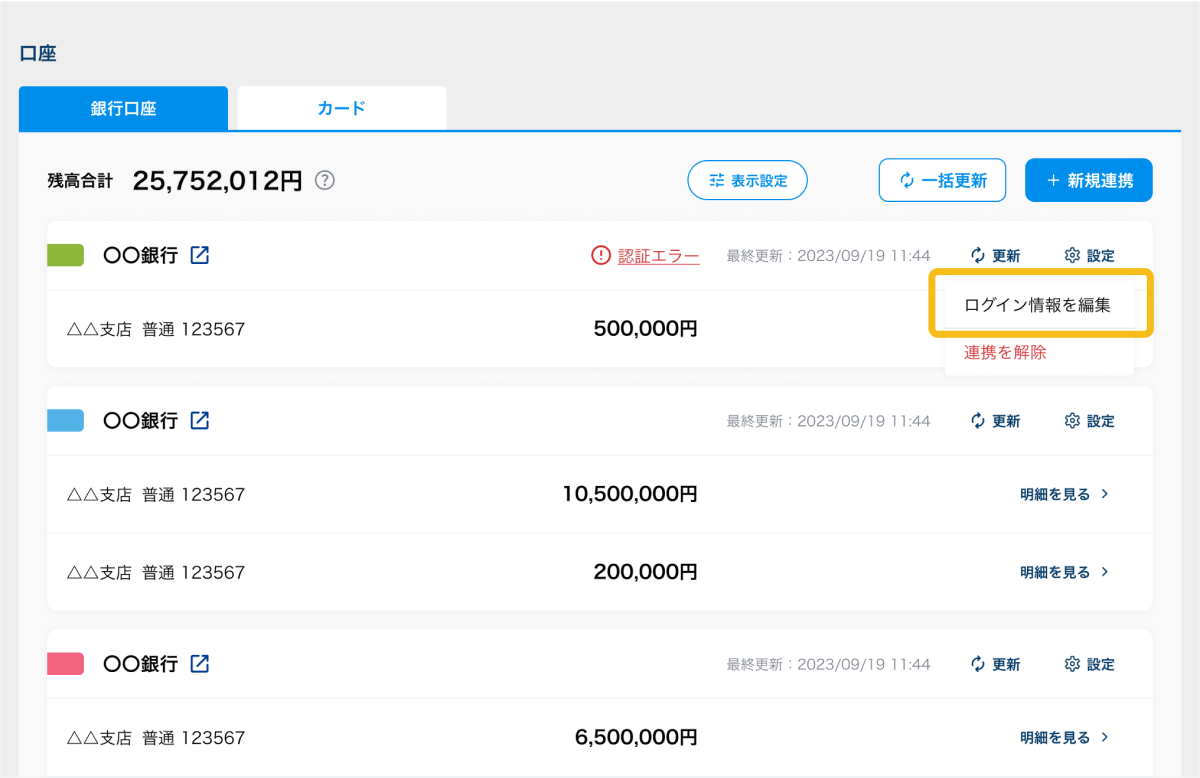 口座・クレジットカード連携(API連携)は一定期間(※1)ごとにデータ取得のために再連携が必要になります。銀行名・カード名横に「認証エラー」のマークが表示されている場合は、クリックしてエラー内容を確認します。再連携を促す内容が表示されている場合は、以下の手順で再連携を試してください。