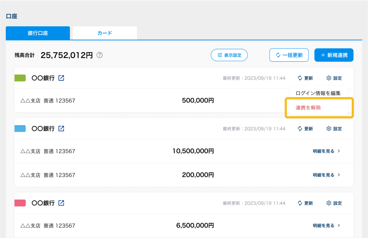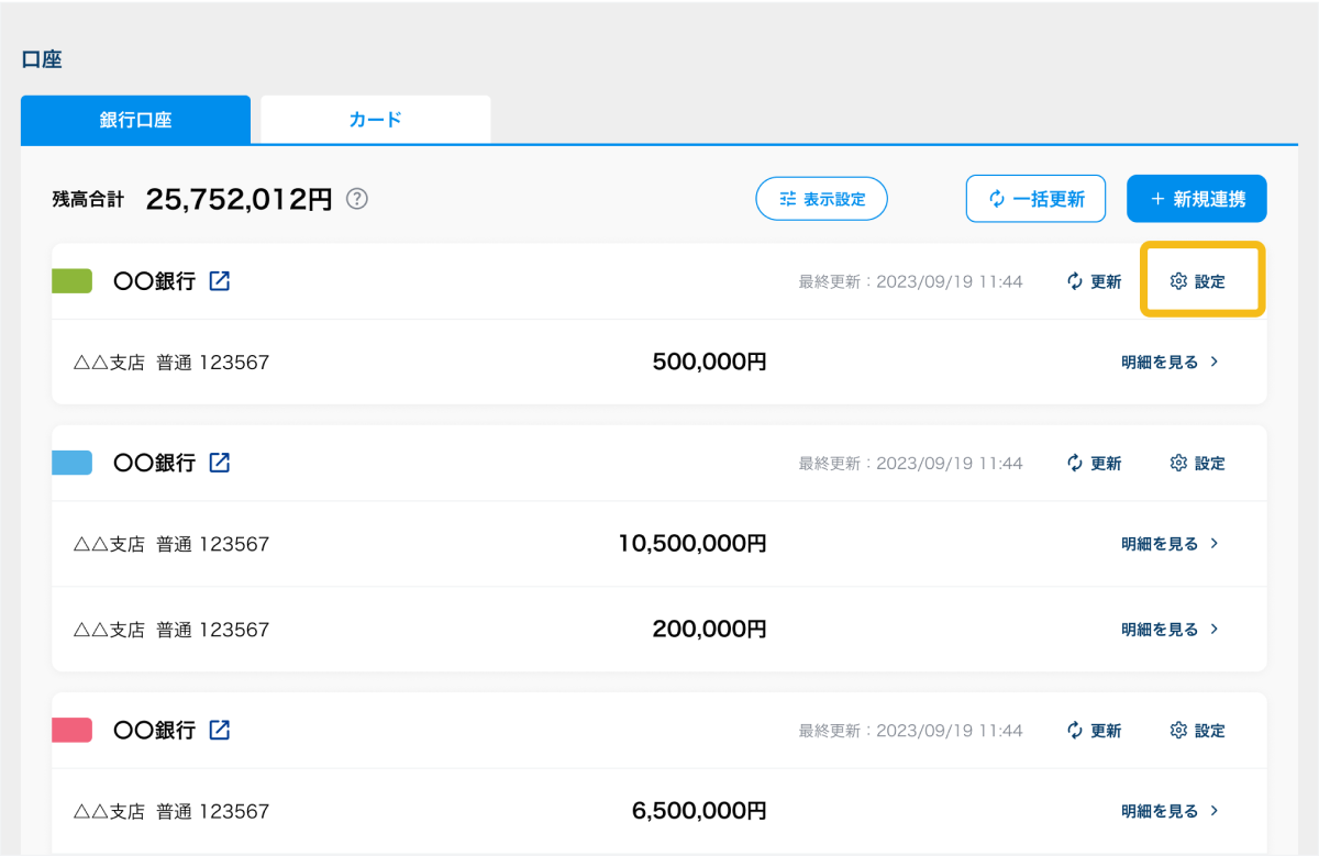 1. 連携を解除したい口座の「設定」ボタンを押す