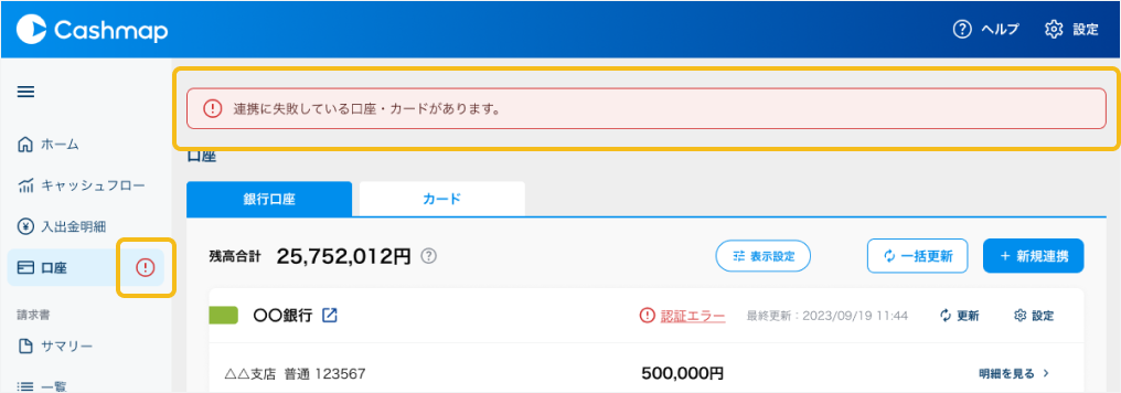 連携している口座またはクレジットカードで認証エラーが発生している場合、サイドメニューおよび画面上部にエラーを示すアイコンとメッセージが表示されます。