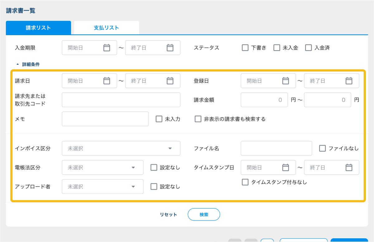 入金期限/ステータス項目 の他、「請求日」「請求先または取引先コード」「請求金額」などの条件指定ができます。