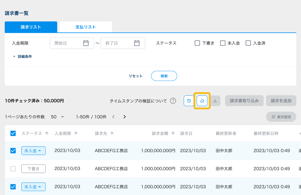 対象請求書にチェックを入れ、以下枠内のボタンを押すと一括でステータスを変更することも可能です。