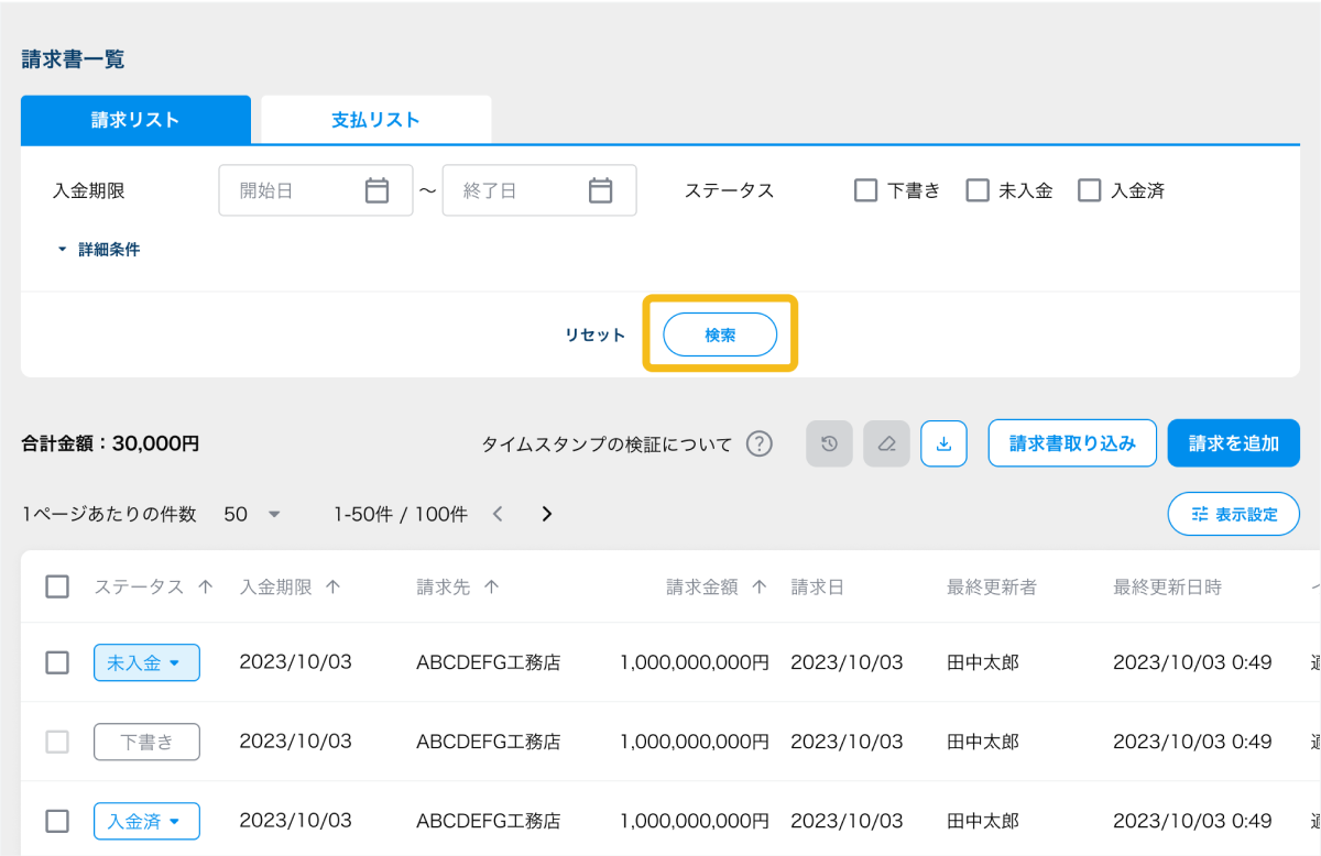 請求書(入金)一覧に検索条件に含まれる請求書が抽出されます。