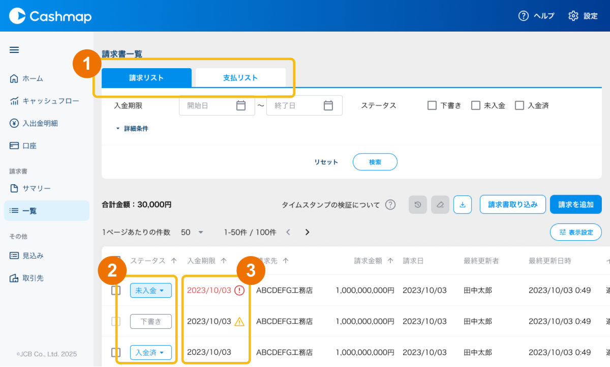 「請求書一覧」画面では、登録した請求書情報を確認し、ステータスの管理や期日の確認を行えます。