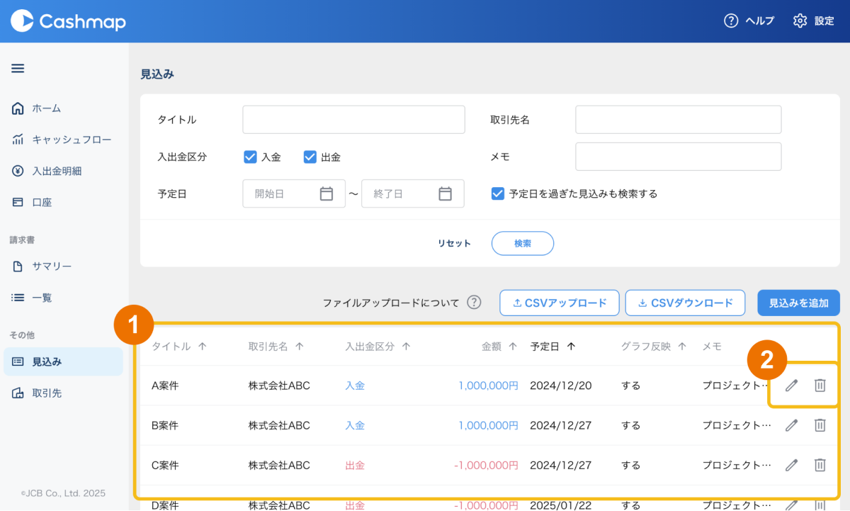 「見込み」画面では入出金の見込みの登録・確認ができます。登録した入出金の見込みはキャッシュフロー画面に反映され、将来発生する予定の入出金を加味したキャッシュフローを確認できるようになります。