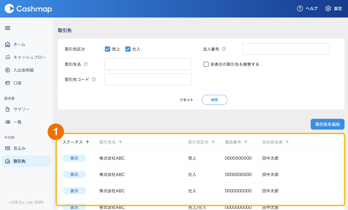 「取引先」画面では、取引先の登録・確認ができます。登録した取引先は請求書の請求先・支払先、見込みの取引先として選択できます。