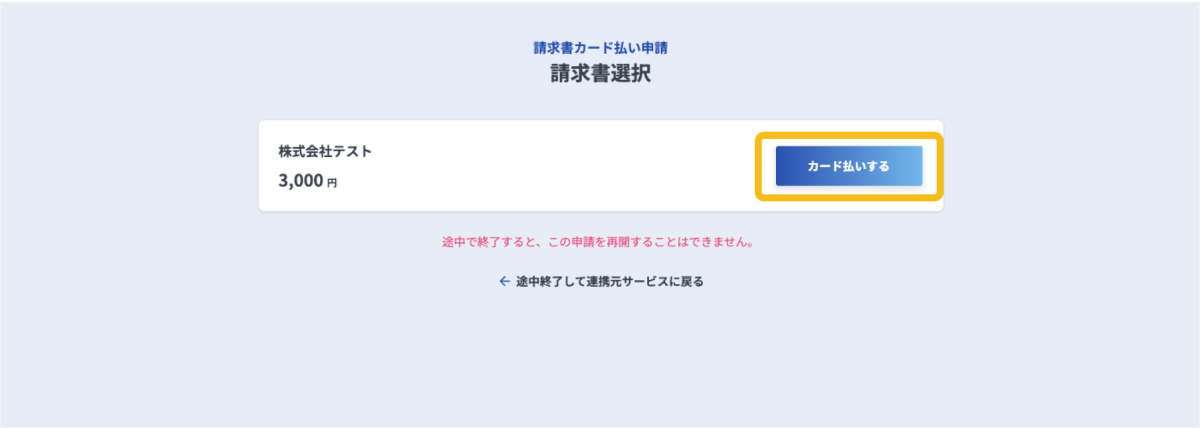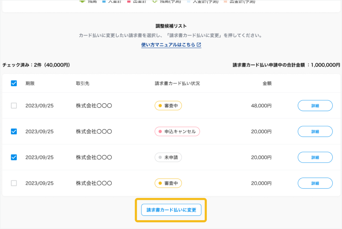 対象の請求書を「請求書カード払い」に変更申請する方法について説明します。なお、この機能を利用するためには事前に「請求書カード払い」との連携が必要です。連携方法は、以下を参照ください。